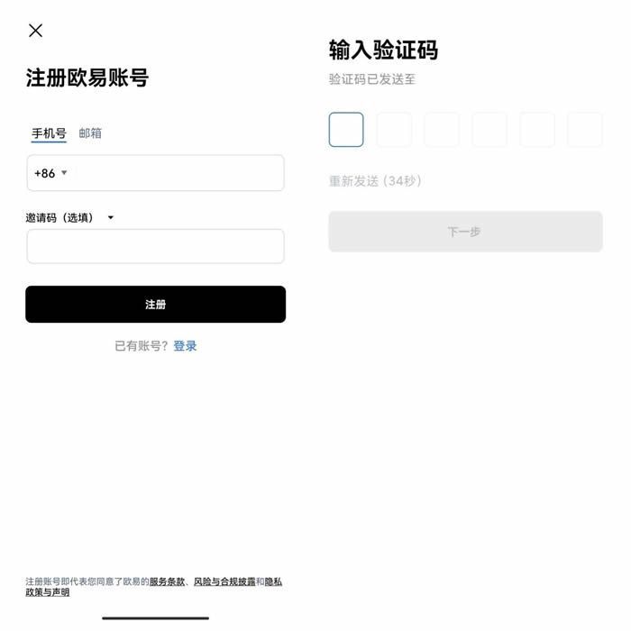 1、打开欧易APP,点击“注册账号”;注册分为手机号注册和邮箱注册两种方式,您可以自由选择注册类型,然后按照要求填写完整相应信息即可完成注册。