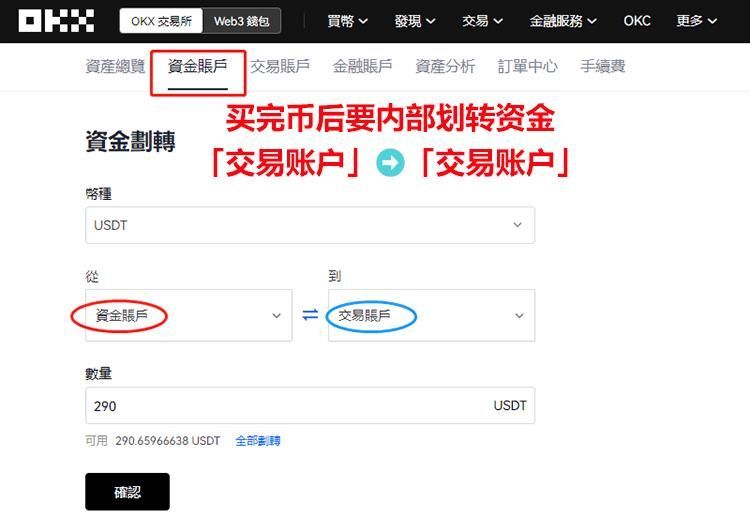 由于在OKX上,点对点账户资金账户(买币获得的加密资产)和交易账户(币币交易获得的交易资产)是不互通的,需要手动操作来转移。